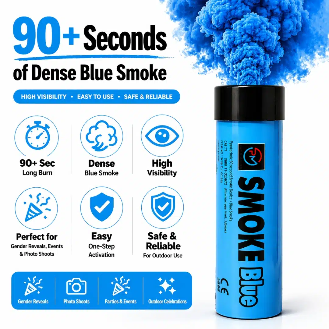 This blue smoke flare (90 seconds) creates a powerful visual impact with thick, high-density blue smoke, making it ideal for a wide range of outdoor events and celebrations. Whether you’re planning a football entrance, gender reveal, or professional photoshoot, this wire pull smoke flare delivers bold colour and reliable performance.
