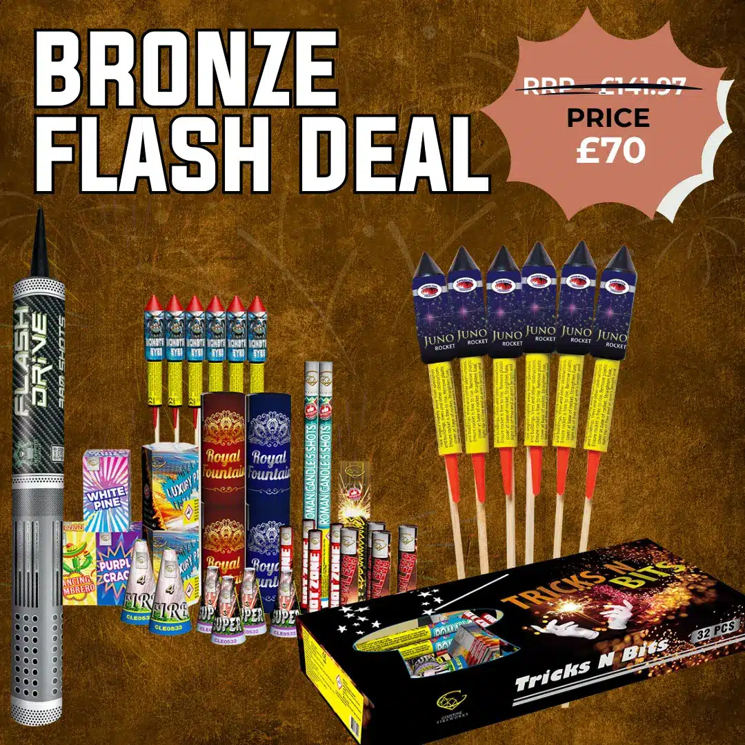 The Bronze Flash Deal is built for families and party hosts who want an easy, ready-made display. With a large selection box, quality rockets and a powerful finale cake, this fireworks deal offers big savings and balanced variety.