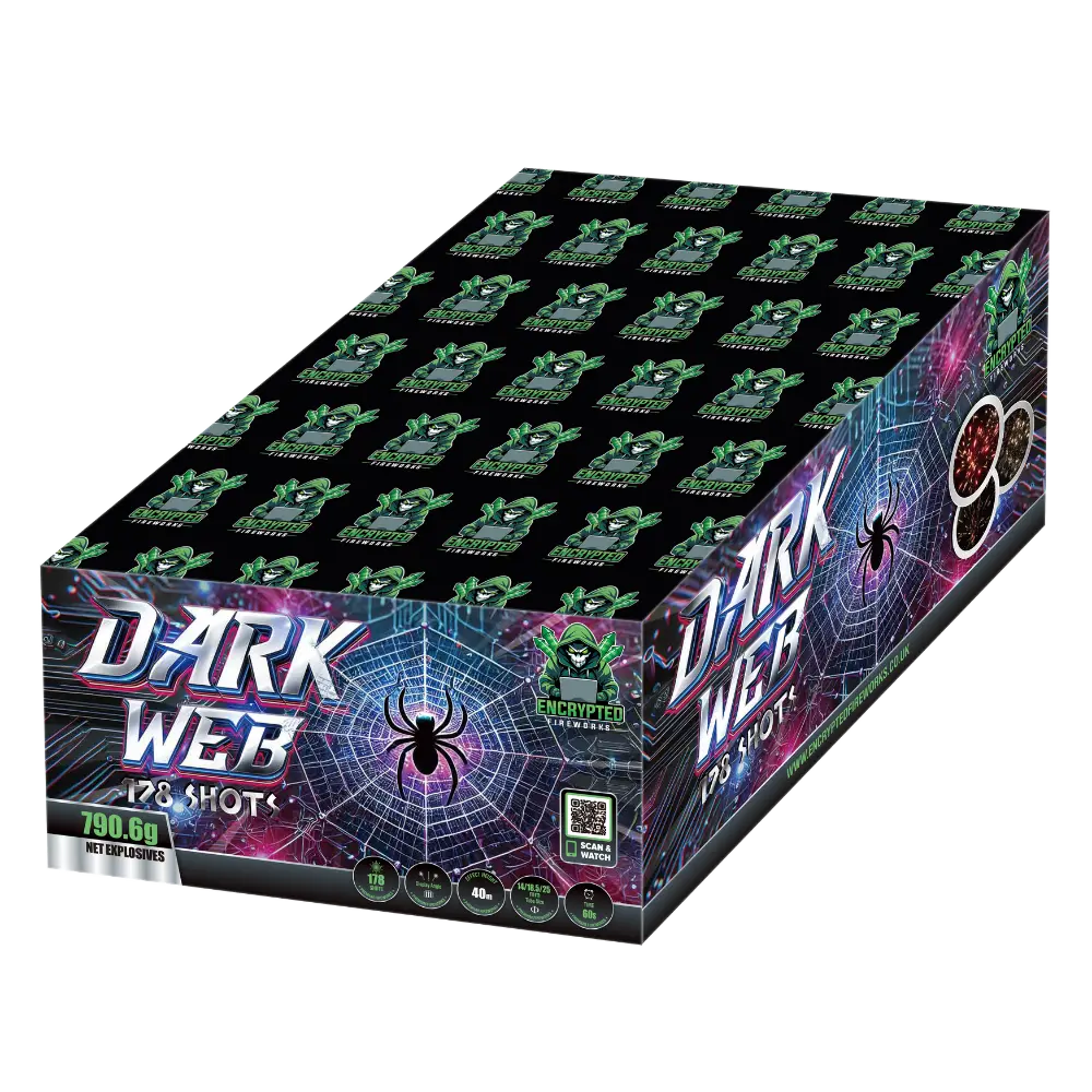 Dark Web is a 178 shot F3 cake firework manufactured by Encrypted Fireworks and supplied in the UK by Top Shotter Fireworks. It features mixed firing angles, multiple calibre tubes, and 790.6g net explosive content (NEC), producing a dynamic aerial display suitable for outdoor fireworks shows on private land.