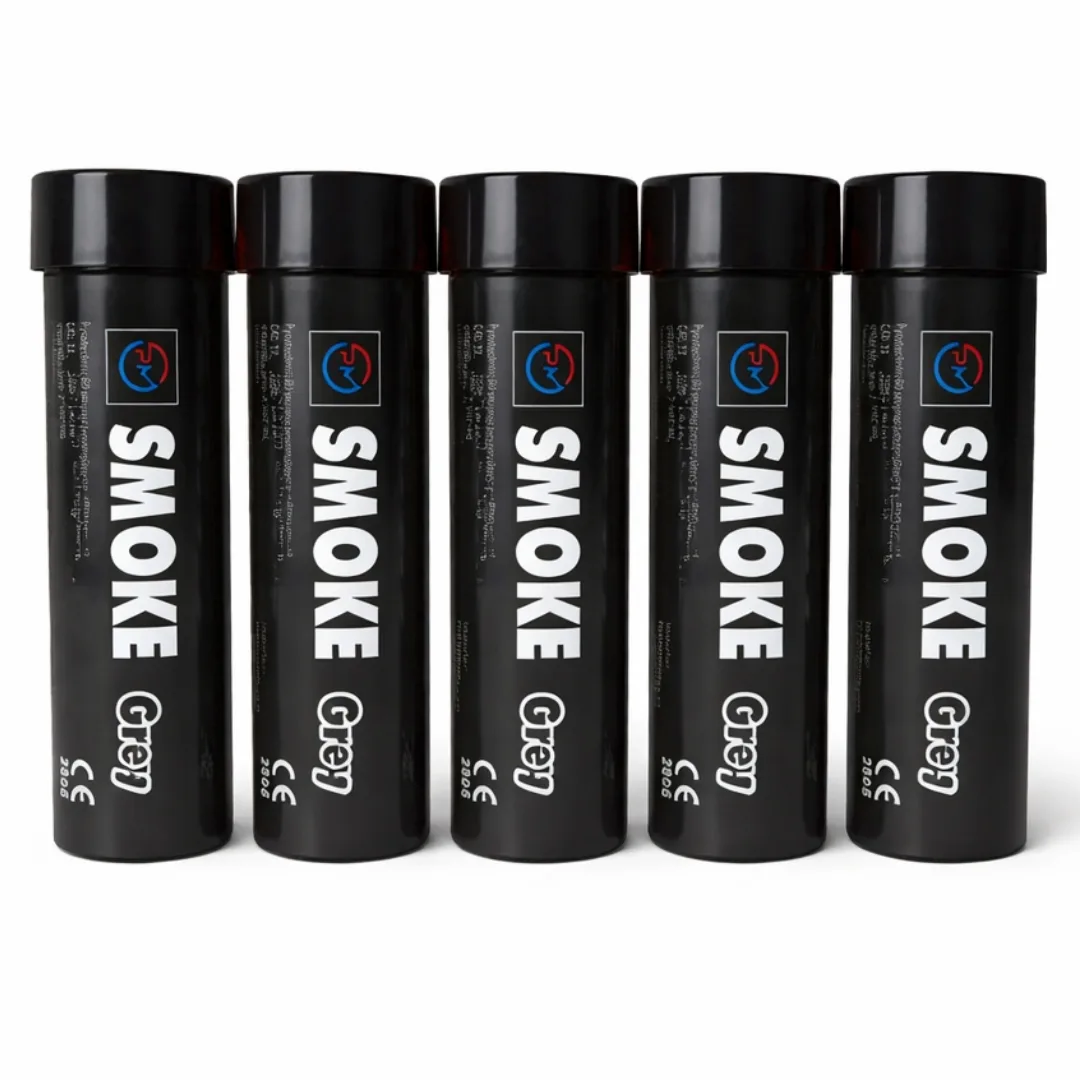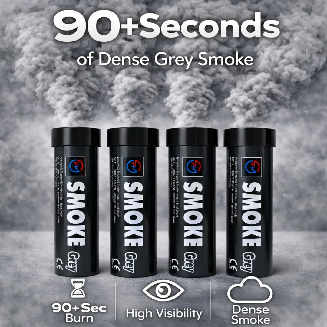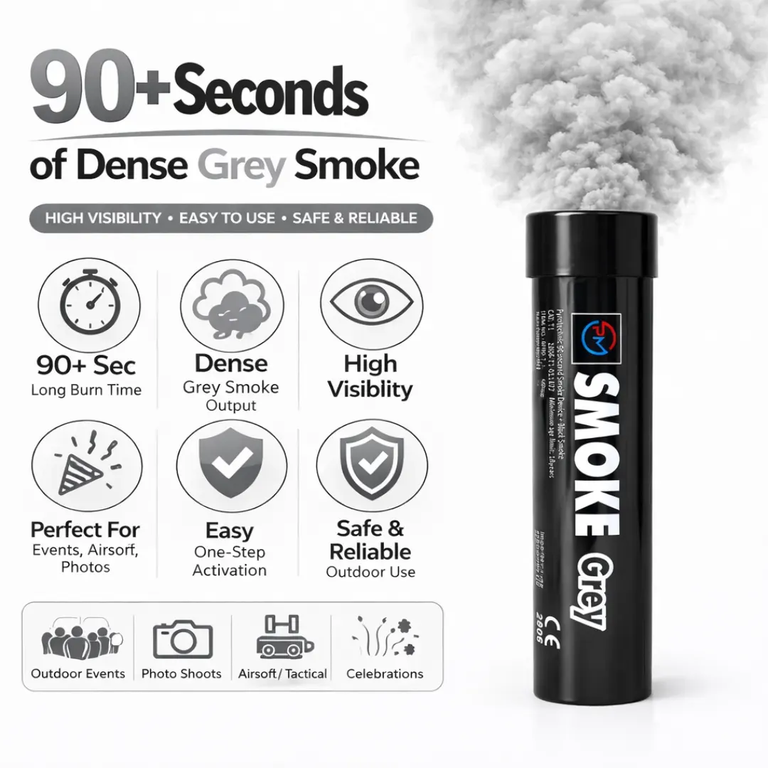 This grey smoke flare (90 seconds) produces thick, high-density smoke with a dark, dramatic appearance. Often used to create a black smoke effect in certain lighting conditions, it is ideal for cinematic visuals, photography, and atmospheric event setups.
