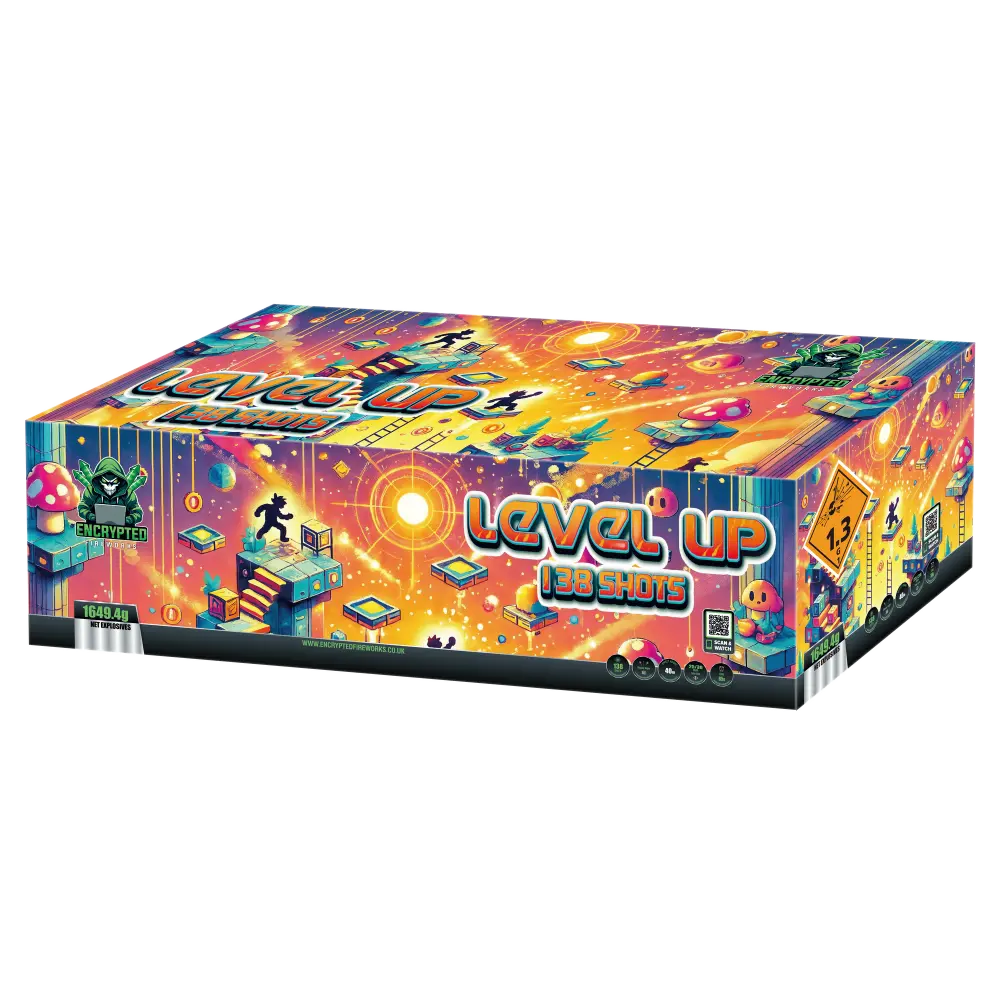 Level Up is a 138 shot F2 compound cake firework manufactured by Encrypted Fireworks and supplied in the UK by Top Shotter Fireworks. It features mixed firing angles, 25mm and 30mm tubes, and 1649.4g net explosive content (NEC), producing a powerful fireworks display suitable for outdoor celebrations and private events.