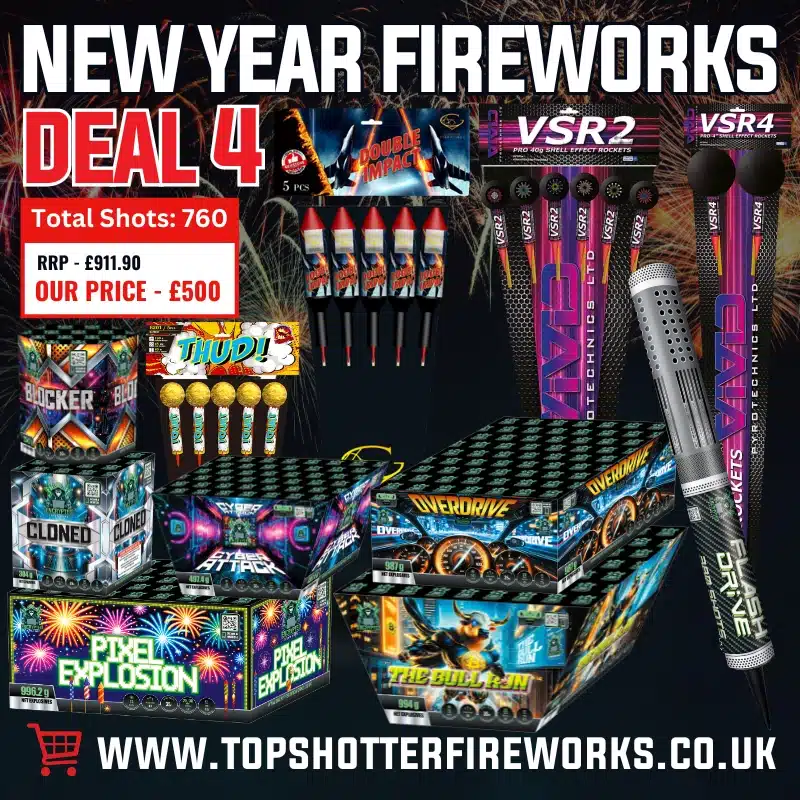 Introducing the New Year Fireworks Deal 4 – our most powerful and complete New Year fireworks bundle for customers who want a serious, sky-filling display. This deal builds on the explosive performance of Deal 3 and takes things even further with the addition of the Overdrive 141 Shot Cake, transforming your New Year’s Eve celebration into a near-professional fireworks show.