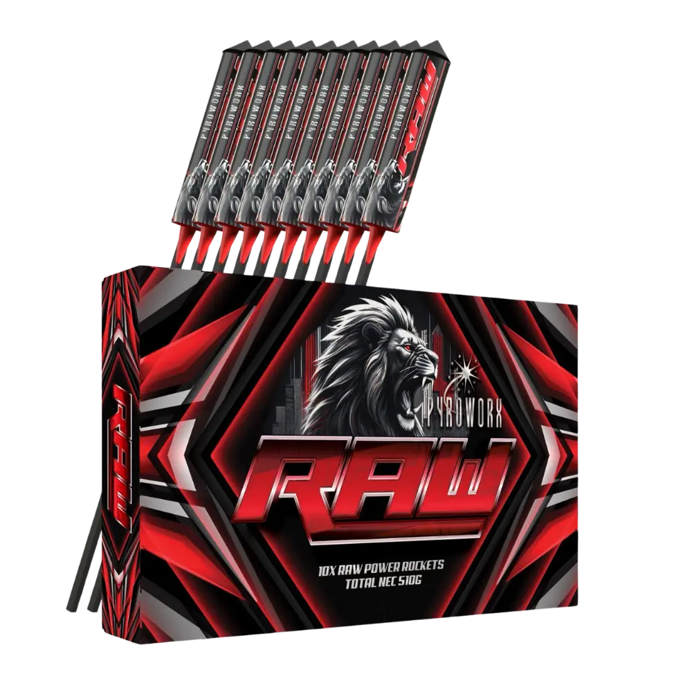 Raw by Pyroworx proves that great things come in small packages. This exclusive 10-rocket pack includes two dazzling effects: golden tails and silver tails. With 50g NEC per rocket (totalling 500g per pack), these raw rockets are compact, loud, and visually stunning.