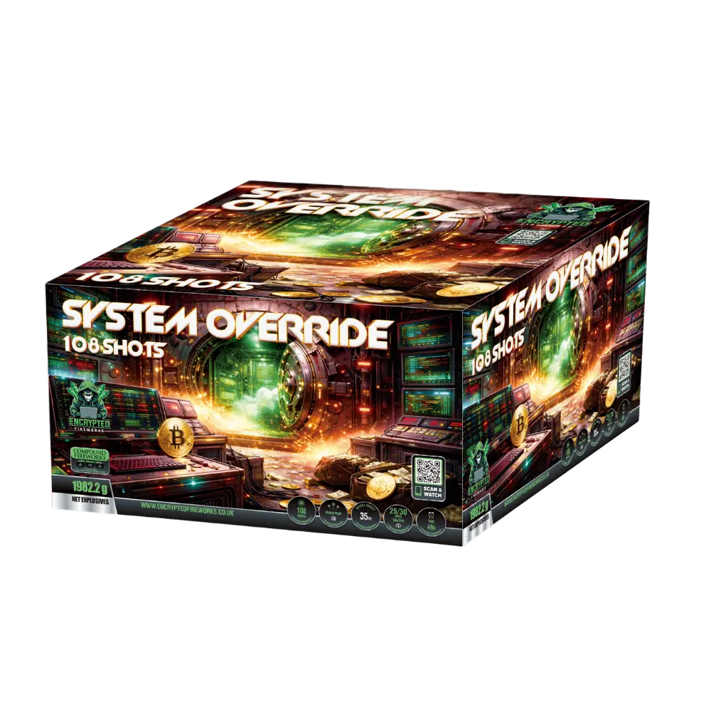 System Override is a 108 shot F2 compound firework manufactured by Encrypted Fireworks and supplied in the UK by Top Shotter Fireworks. It features 25mm and 30mm tubes, mixed firing angles, and 1982.2g net explosive content (NEC), producing large aerial bursts suitable for outdoor fireworks displays.