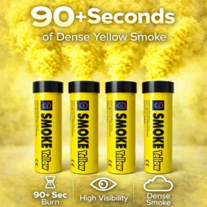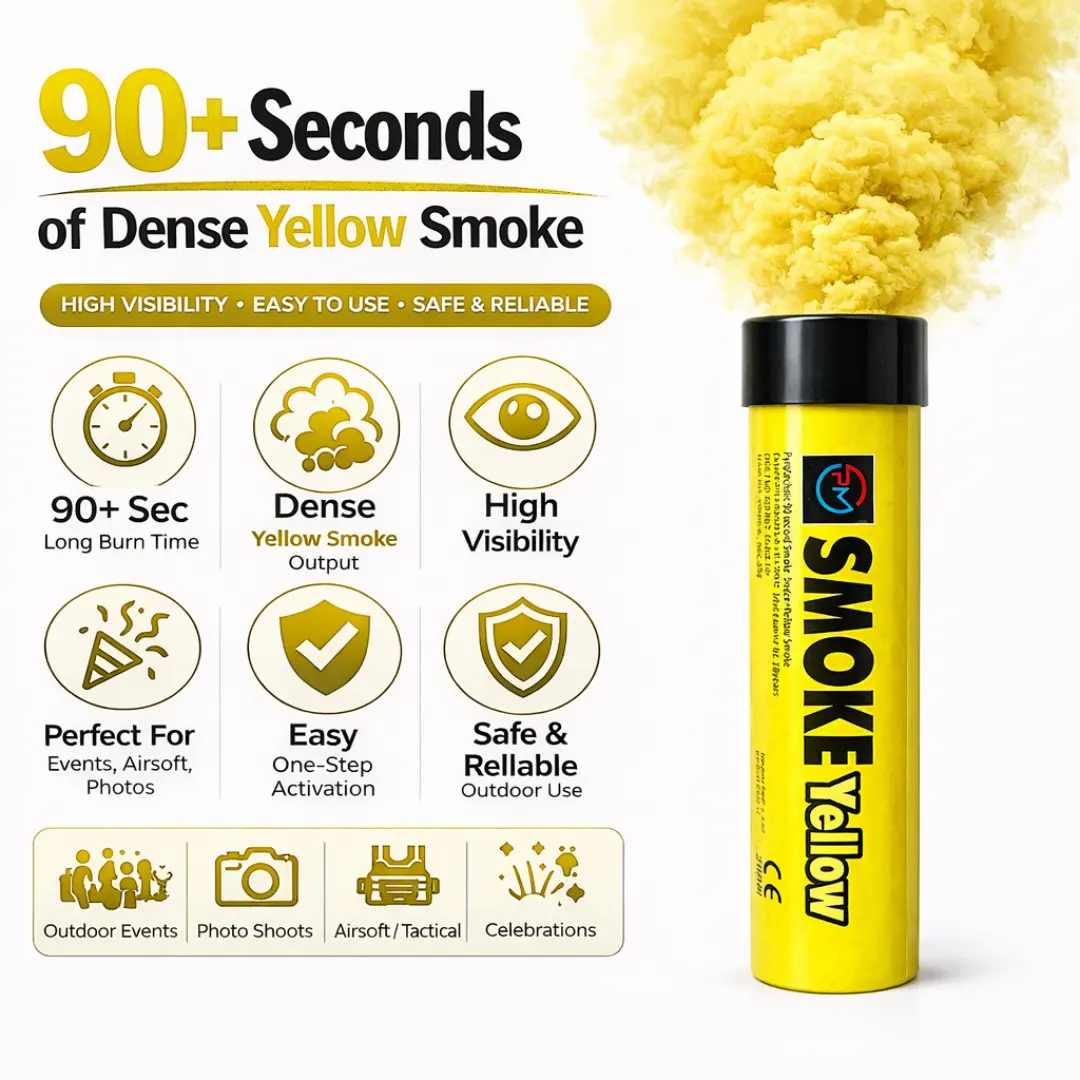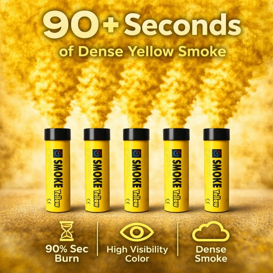 This yellow smoke flare (90 seconds) is designed to produce bright, high-visibility smoke that stands out clearly in outdoor environments. Known for its strong contrast and vibrant tone, yellow smoke is perfect for daytime use, making it ideal for events, celebrations, and creative photography.
