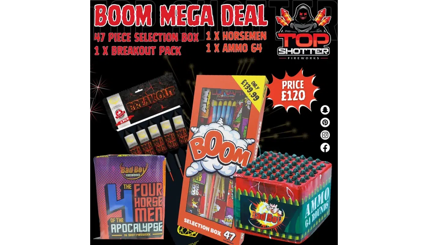 Merlin Mega Deal – the ultimate bundle featuring the Merlin 54-piece Selection Box, Breakout Rockets by Gemstone, and a 380-shot Flash Drive roman candle by Encrypted Fireworks. Big savings in one pack.